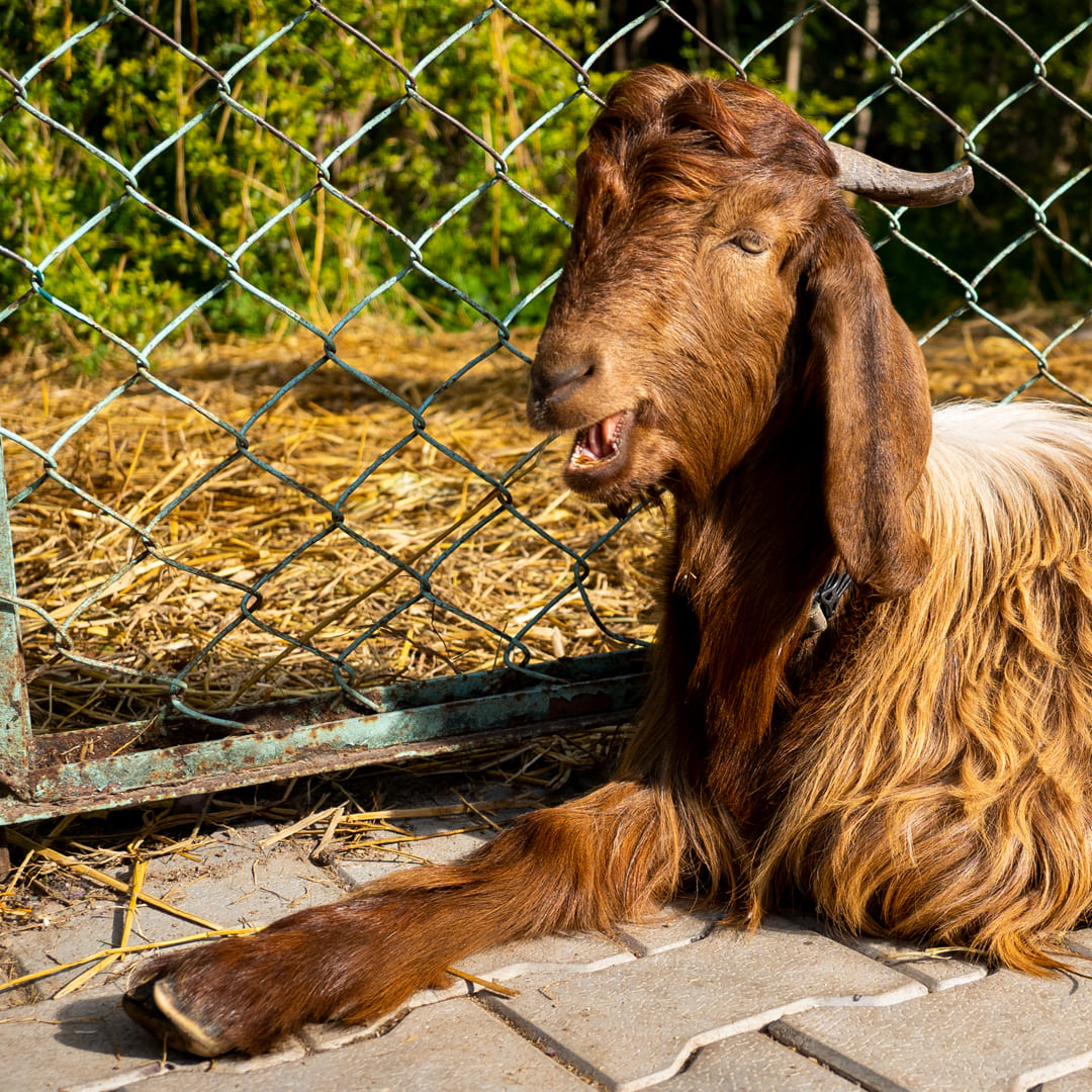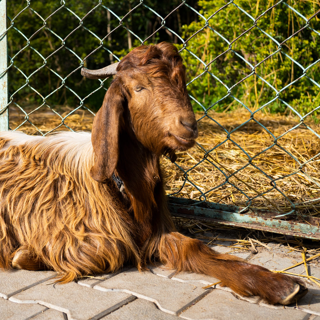 Raaja, a male goat, was rescued from Dharamshala, where he was found alone and abandoned. A kind family took him in, intending to adopt him, and gave him an extraordinary level of care—pampered with love, fed well, and even given his own bed! However, they realized that their rented home and busy schedules weren't the ideal environment for Raaja's needs. When we saw photos of young Raaja, we were excited to welcome him to the farm. It’s a rare opportunity to rescue a goat, given the risks they face. Now a permanent resident here, Raaja truly lives like a king. He once had a queen, Betiji, who sadly passed away, but he’s now found friendship with another male goat, Betaji. Support Raaja and help us continue to give him the royal care he deserves. Click “SPONSOR” today!