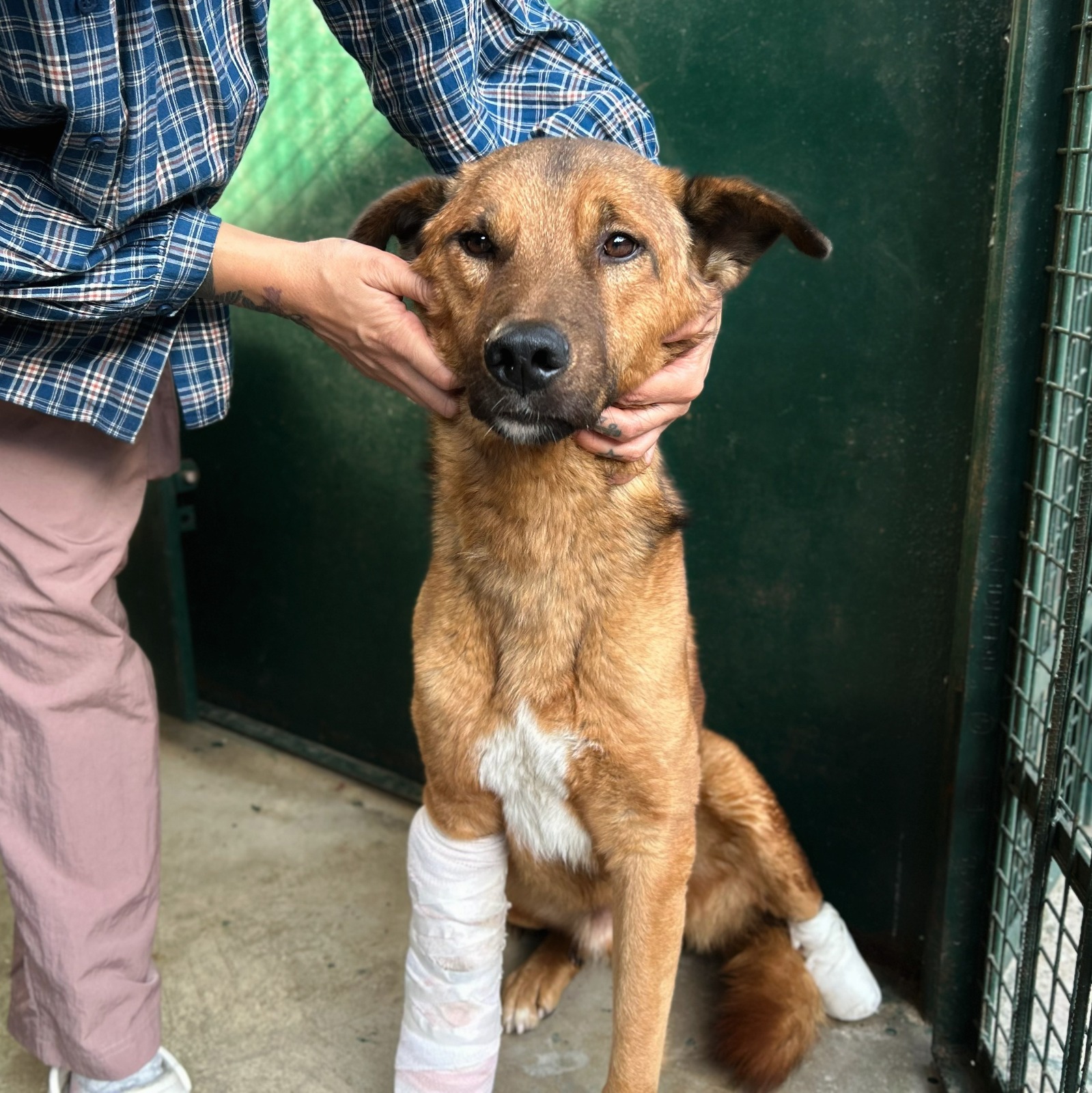 Duke was brought to us from Hamirpur with a fractured front leg — and his hind leg was already half-amputated when he arrived. He must have been in terrible pain for a long time before someone finally helped him. We’ve put a splint on his front leg, started him on supplements, and we’re doing regular dressing to keep his wounds clean and healing. His recovery will be slow, and it will take around two months for him to get better. Duke is a brave boy who has survived more than most dogs ever should. He still needs steady care, medicine, and support to heal. Would you like to sponsor his recovery?