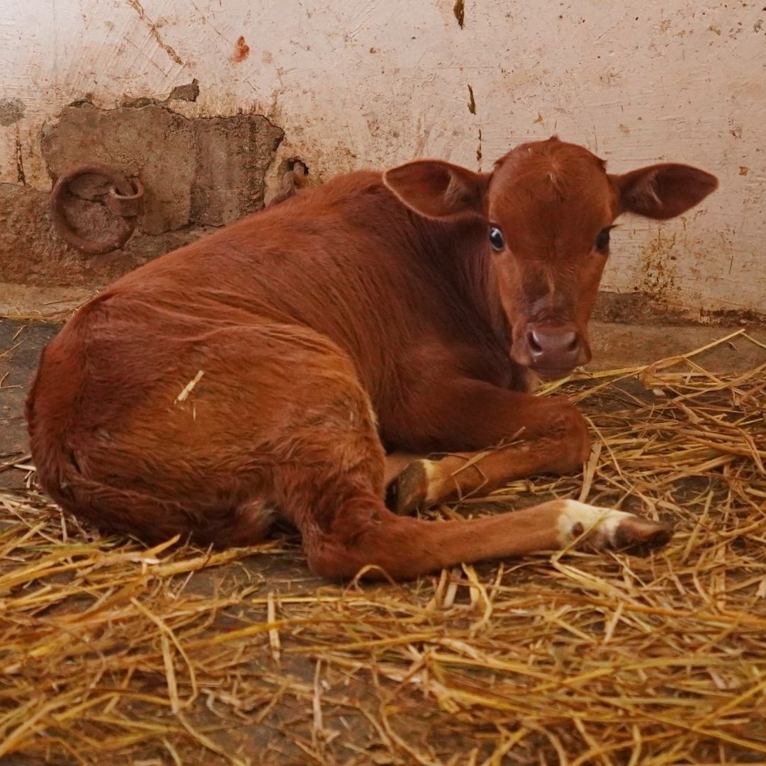 A reddish-brown cow with small horns standing next to a reddish-brown calf. The calf appears to be very young, possibly a newborn, and is standing on straw bedding.
