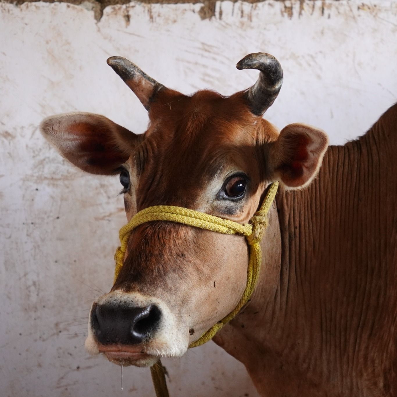 A medium-sized brown cow with some lighter patches on its back and sides. It has small horns and a yellow halter around its head. The cow appears to be in a stall with hay on the ground.
