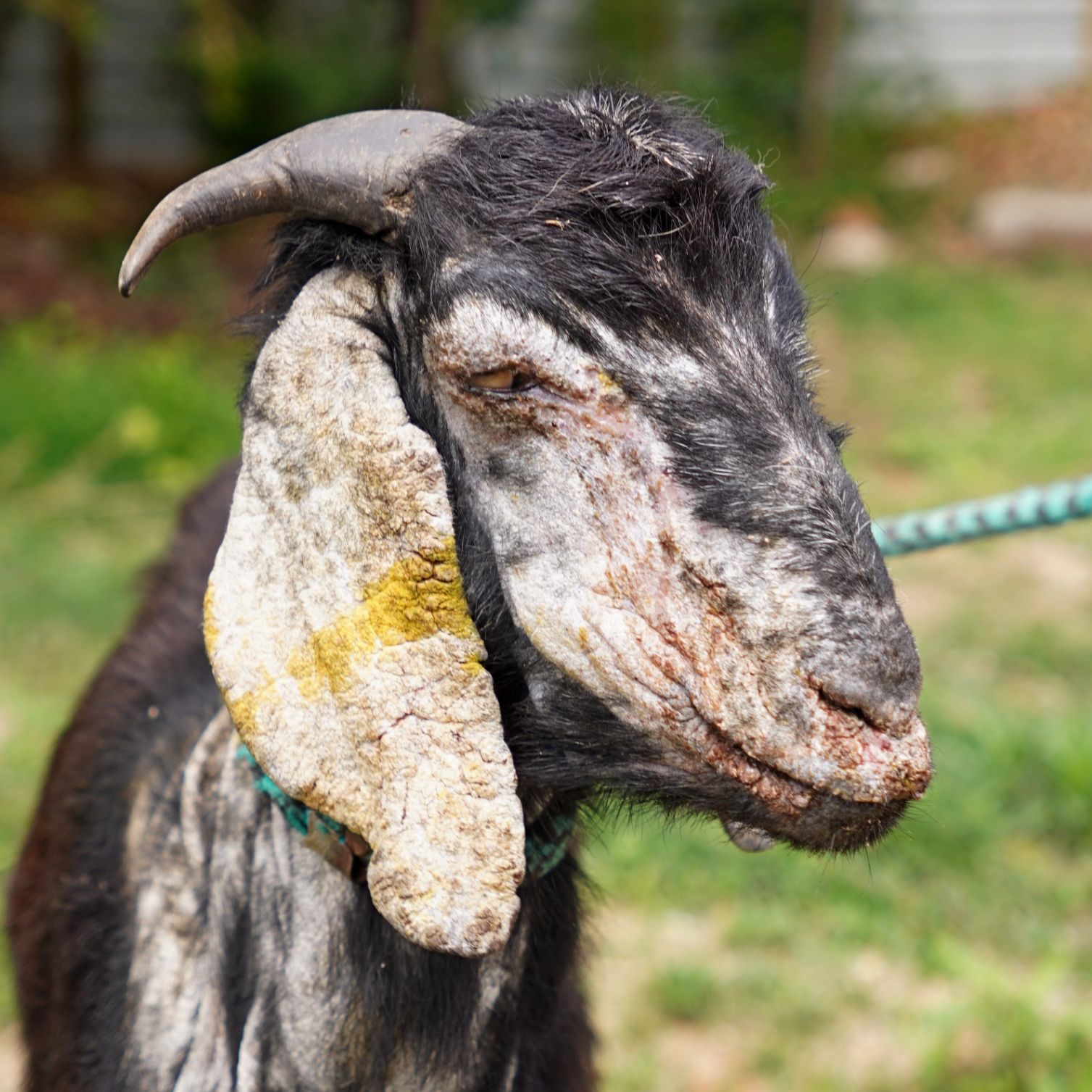 A dark-furred goat with patches of lighter fur, possibly indicating skin issues or hair loss. It has yellow/lime green paint on its head and ears. A blue rope is tied around its neck and one leg. There appears to be a wound or severe irritation around its tail area.
