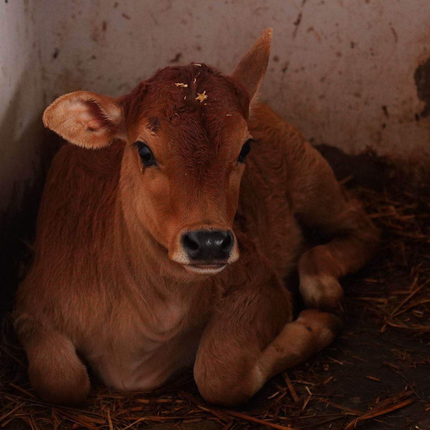 A young brown bovine with white spots is seen sleeping on a bed of straw. It is wearing a black and white patterned blanket or jacket.