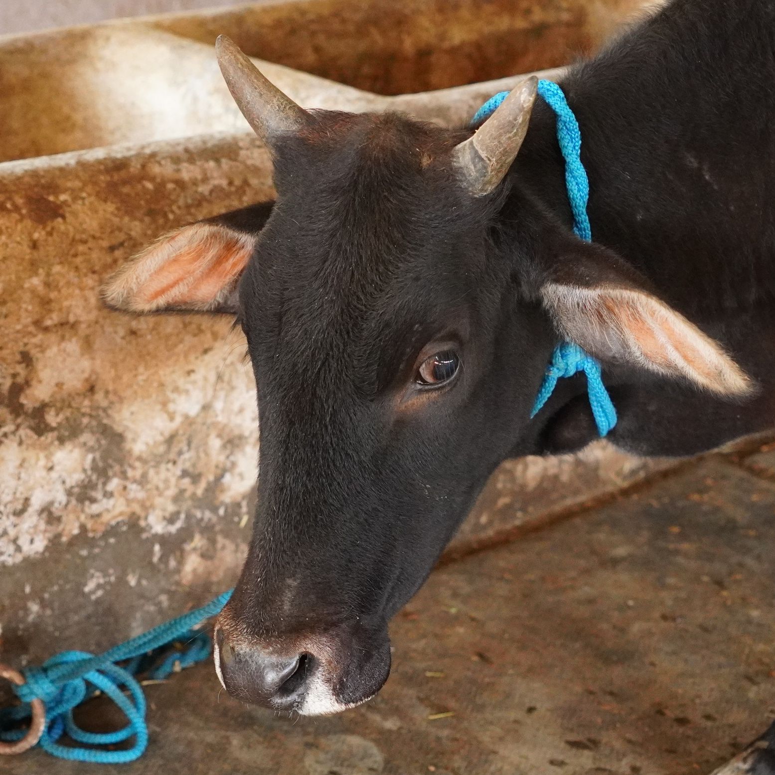 A black animal is lying down. Its left front leg is bandaged with white material, and there is blood on the ground near the injury. The animal has small horns.