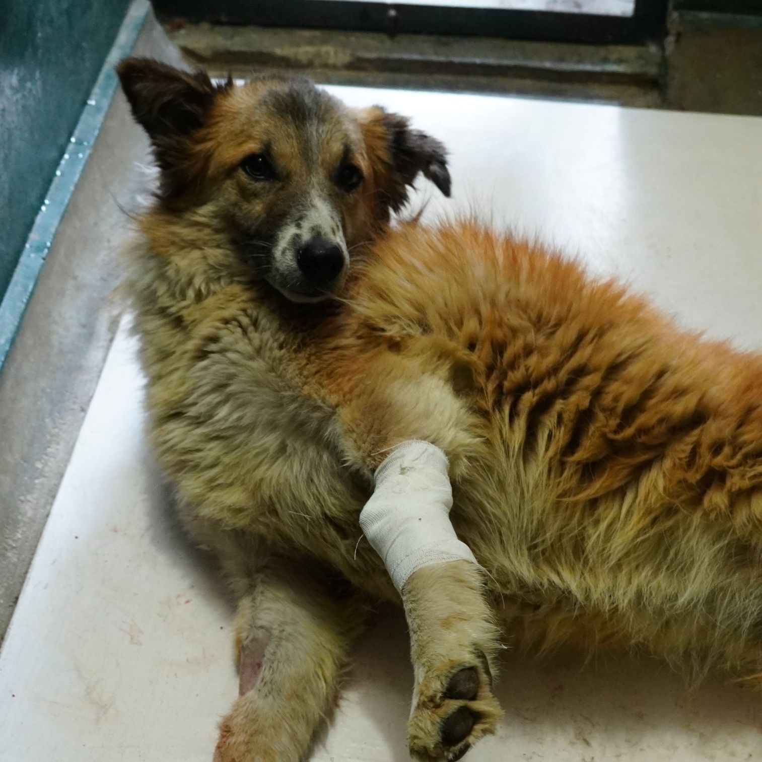 A medium-sized dog with light brown and cream-colored fur is sitting inside a metal cage. Its mouth is slightly open, showing its teeth. No visible injuries or wounds are apparent.
