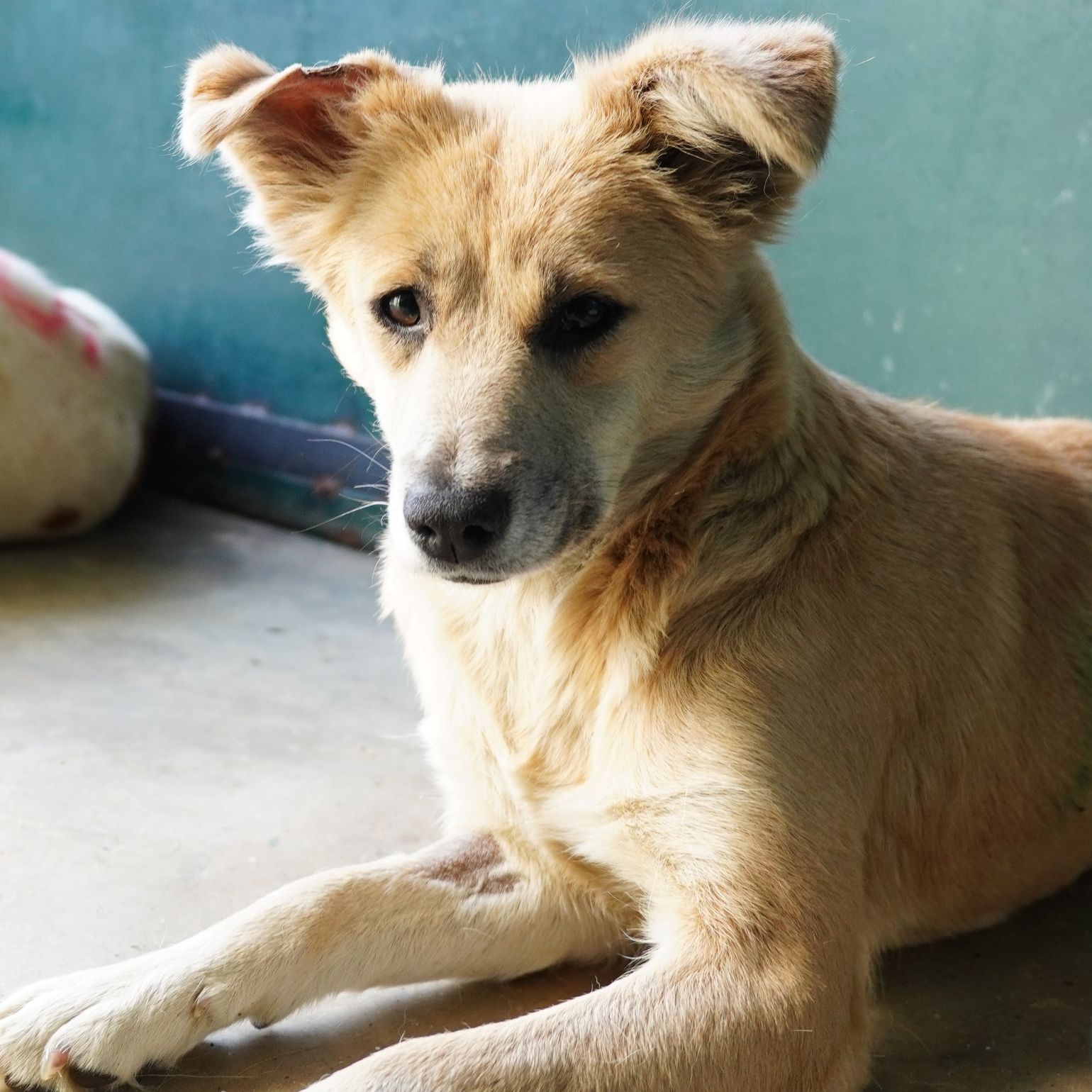 One light brown dog is sitting in the foreground, looking towards the camera. Another white dog is visible through an opening, lying down with red markings on its back. Both are in a room with peeling dark green paint and wood shavings on the floor.